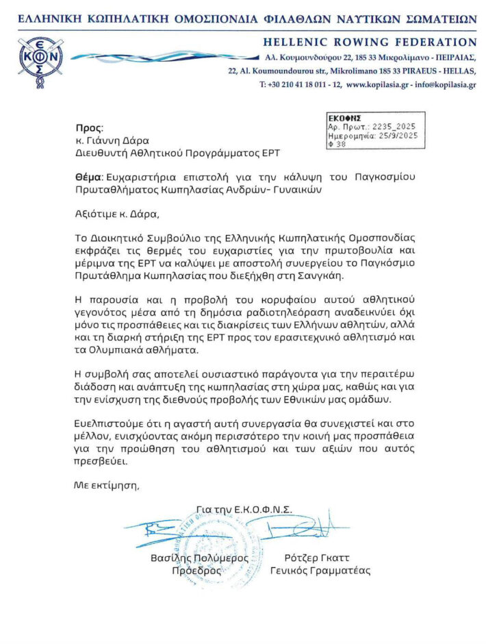 Η Διοίκηση της Ελληνικής Κωπηλατικής Ομοσπονδίας σχετική επιστολή εξέφρασε τις θερμές της ευχαριστίες και τα συγχαρητήριά της προς την ΕΡΤ, για την απόφασή της να καλύψει το Παγκόσμιο Πρωτάθλημα Κωπηλασίας στη Σανγκάη με δύο απεσταλμένους, τον κ. Ηλία Χριστογιαννόπουλο και την κα Ευγενία Γήτα.