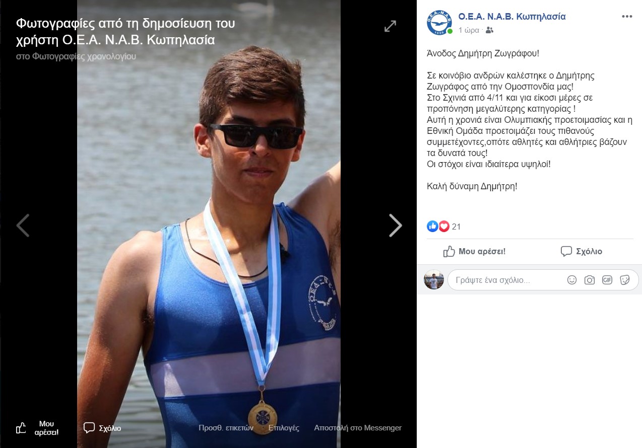 Ο αθλητής του ΟΕΑ-ΝΑΒ Δημήτρης Ζωγράφος, θα βρεθεί ανάμεσα στους “11 εκλεκτούς”, οι οποίοι θα συμμετάσχουν στο κοινόβιο ανδρών της εθνικής ομάδας στο Ολυμπιακό Κωπηλατοδρόμιο του Σχινιά, από αύριο Δευτέρα (4/11) και για είκοσι μέρες.