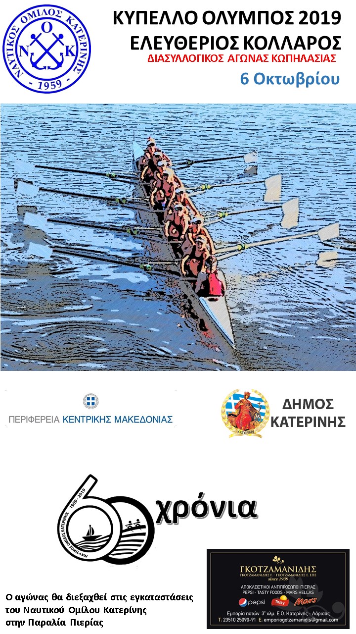 Πλούσια αγωνιστική δραστηριότητα για το άθλημα της κωπηλασία θα περιελαμβάνει η Κυριακή (06/10), καθώς ο Ναυτικός Όμιλος Κατερίνης θα διοργανώσει τους Διασυλλογικούς Κωπηλατικούς Αγώνες «Κύπελλο Όλυμπος 2019-Κολλάρος Ελευθέριος». Οι αγώνες θα ξεκινήσουν στις 09.30 και θα πραγματοποιηθούν στο χώρο μπροστά από τις εγκαταστάσεις του Ομίλου.